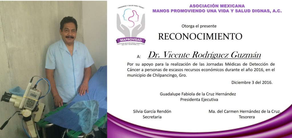 Maprovisad, A.C. hace un merecido reconocimiento al Dr. Vicente Rodríguez Guzmán por el gran apoyo otorgado a la mujer guerrerense, al traer el personal y equipo médico necesario para realizar estudios de detección oportuna de cáncer ginecológico a costos muy accesibles a la población.